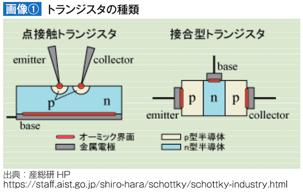 トランジスタは真空管の欠点をほぼ全て克服したもので、小さく、消費電力は少なく(=発熱も少ない)、衝撃にも強い。ただ、初期のトランジスタは動作が安定していなかったのです。トランジスタを開発したのは、ベル研究所のジョン・バーディーン、ウォルター・ブラッテン、ウィリアム・ショックレーの3人のチームで、主にショックレーが開発を主導しました。点接触型トランジスタは量産に向かず、ショックレーを中心に安定動作を可能にした接合型トランジスタが開発されます(画像①)。