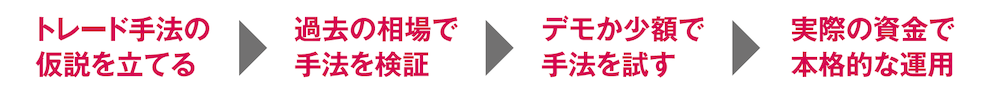 ただ、このデモトレードの前に、もう一つ重要なプロセスがあることは、そんなに定着していません。そのプロセスとは、「検証」です。この検証を、デモトレードの前にしっかり行わないと、FXで利益を出すことは難しいです。