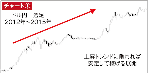 上のチャートは第二次安倍内閣発足から始まった上昇トレンド、俗にいうアベノミクスとそれに続く上昇トレンドです。誰の目にも明らかな上昇局面で、買い戦略で流れに乗れれば、誰でも容易に利益を出せることは明白ですよね。このように、発生したトレンドをしっかりつかまえにいくことは、投資の王道といえます。