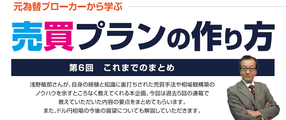 浅野敏郎さんが、自身の経験と知識に裏打ちされた売買手法や相場観構築のノウハウを余ところなく教えてくれる本企画。今回は過去5回の連載で教えていただいた内容の要点をまとめてもらいます。また、ドル円相場の今後の展望についても解説していただきます。