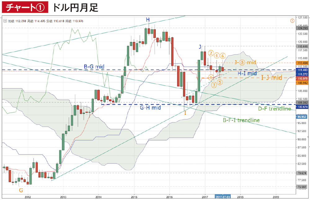 半値線を使った判断は前号で説明しました。ドル円月足のチャート①では、強かった上昇相場G-HがH-Iの押し目を入れた後、H-Iの半値以上で底堅く推移できている現状はG-Hの影響が生きている状況ですから、取り組むとすれば上昇を意識したいところです。