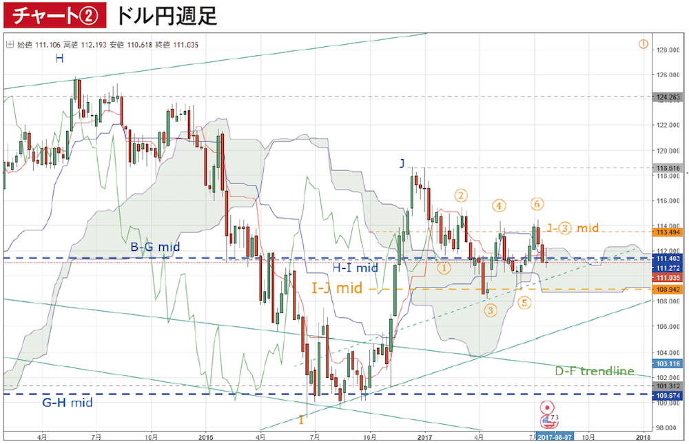 今後の注目点としては、以前から指摘しているB-Gの半値水準とH-Iの半値水準が、111.30~111.55水準で接近しており、今後の騰落分岐水準として重要になります。気になるのは、この重要な水準を直近の一週間で一気に割り込み、そのまま引けている点です。次週以降すぐに111円台中盤以上を回復できれば、上昇目線も維持できますが、もし③の安値108.13をしっかり割り込んだ場合は、同時に先行スパンを下抜くことにもなり、しばらく上昇目線はお預けになる公算が高くなるでしょう。