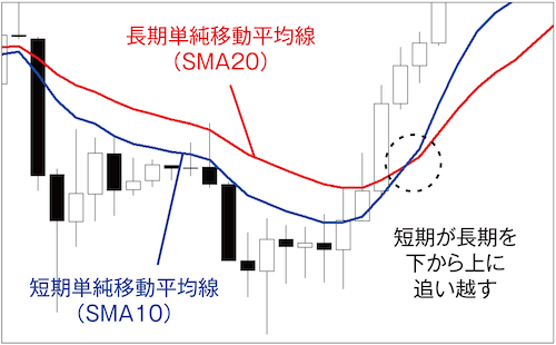 確かなのは「ローソク足過去20本分の平均終値より、ローソク足過去10本分の平均終値が高くなった」ことのみ。