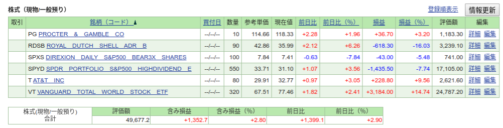 現在の含み益は下記の通りで、確定損失や配当との累計損益では、$4,100のマイナスとなっています。