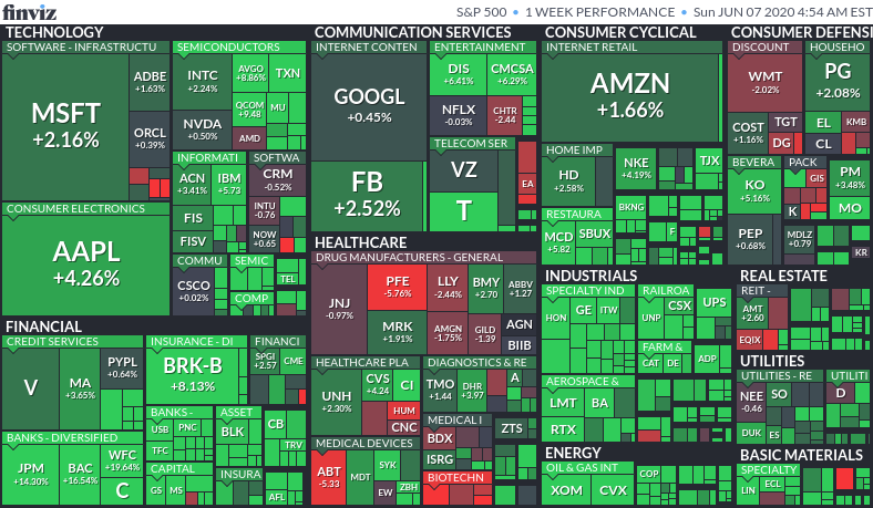 金融やエネルギー、資本材セクターが今週は上昇。(出典:FINVIZ)