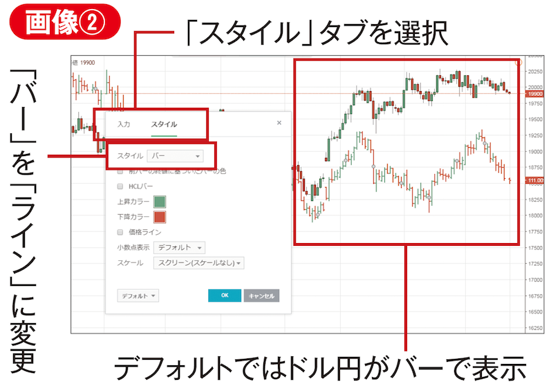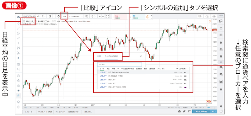 佐々木 これにより、さまざな市場を対象にした興味深い分析ができるようになるので、ぜひ覚えてください。その手順は、チャート上部「比較」をクリックし、「シンボルの追加」タブを選択。「メインチャートに重ねる」にチェックが入っていることを確認し、USDJPYを検索して選びます(画像①)。すると、ドル円がバーで表示されます。