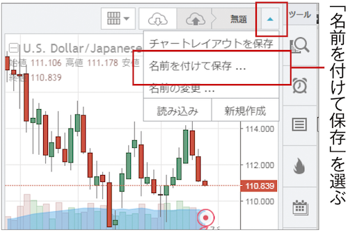 手順としては、保存したい状態まで設定したら、チャート右上の「▲」をクリックし、「名前を付けて保存」を選び、任意の名前を付けるだけです。もちろん、手順は一つだけでなく、この他のルートもありますが、ひとまずはこれを王道として知っておくと良いでしょう。