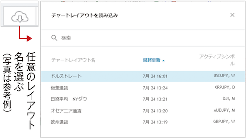 佐々木 この自分流にカスタマイズされたチャートレイアウトを複数用意することで、日々の分析のルーティーンが行いやすくなります。登録したチャートレイアウトを呼び出したい場合は、雲と下向き矢印のアイコンをクリックし、展開したリストから任意のものを選びます。また、チャートにライン等を書き込んだり、インジケーターを追加したりした場合は、雲と上向き矢印のアイコンをクリックすることで上書き保存ができます。