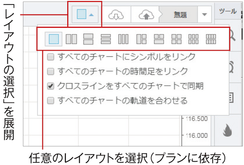 佐々木 一方、有料会員の場合は、チャート右上の「レイアウトの選択」をクリックし、展開した画面から任意のものを選びます。すると、その数と配置に従って暫定のチャート画面が表示されますから、そこに希望の通貨ペア、時間軸などを当てはめていきます。
