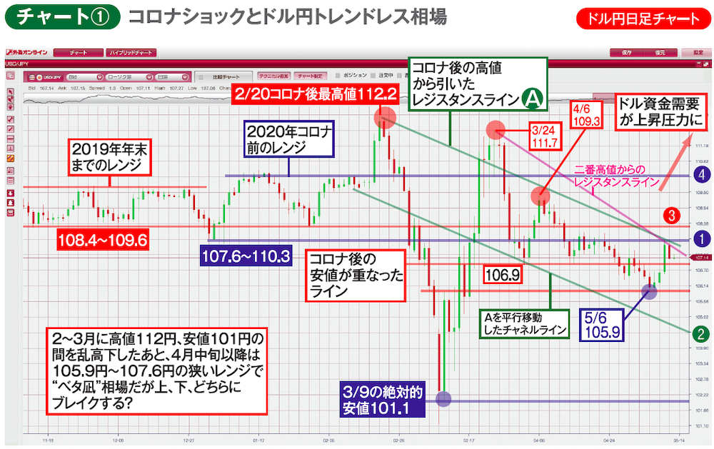 ライン分析は高値同士を結んだレジスタンスライン、安値同士を結んだサポートライン、過去の安値や高値が集まるレートに水平線などを引く、かなり「アナログ」な分析法です。引き方も人それぞれになる可能性がありますが、自分なりに値動きの行方を囲い込むことで、未来を展望したり、相場観、大局観を持ったりできます。今回は、ライン分析でコロナ相場を展望する手法をご覧に入れましょう。