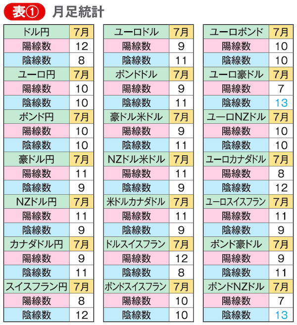 7月の月足アノマリーについては、表①を見ると分かるように傾向があまり出ていないので割愛します。ただ、来月号に記載する予定の8月アノマリーは年に一度の円高傾向が強い月なので注目しておいてください。