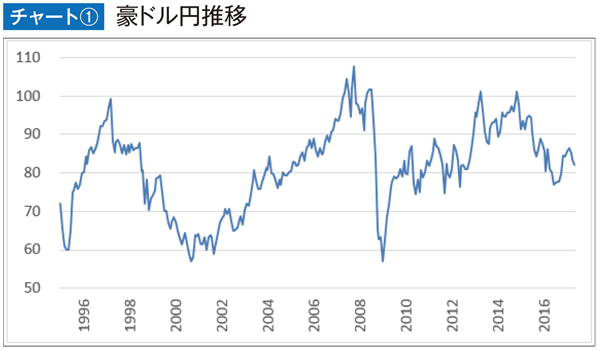 FXで利益を獲得するのは大変なことです。しかし、「過去の実績では」という条件付きながら、豪ドル円やNZドル円を買えば、スワップポイントが毎日プラスになると分かりました。では、今すぐに買ってもOKでしょうか。ここで、月足チャートの出番です。豪ドル円のチャート①を見ながら考えましょう。
