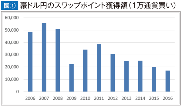 図①は、くりっく365で豪ドル円を1万通貨買って持ち続けた場合の、毎年のスワップポイント獲得額をグラフ化したものです。2008年のリーマンショック後に各国の金利は大きく低下しました。それを受けて、スワップポイント獲得額も次第に低下している様子が分かります。しかし、マイナスになった年がないことに注目できるでしょう。