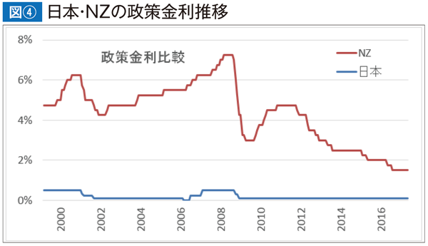 そして、政策金利差も豪ドル円と同じような感じに見えます(図④)。ニュージーランドの政策金利が低下傾向にあるのが気になりますが、このデータから予測できる範囲においては、NZドル円を買うとスワップポイントは毎日プラスになると予想可能です。