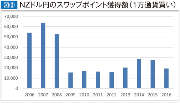 図③を見ると分かるように、豪ドル円以上に2008年までと2009年以降の差がはっきりしています。しかし、毎年プラスになっています。そして、毎日のスワップポイントを確認しても、マイナスに転落した日が1日もありませんでした。