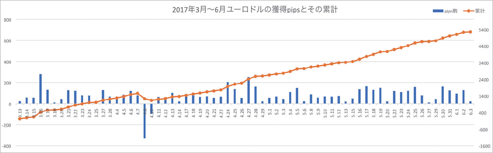 3月13日〜6月3日のユーロドルの実績+5244.6pips(利食い5668.7pips−損切り424.1pips)