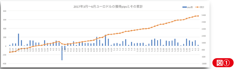 3月13日から稼働させているユーロドルロングのトラッキングトレードは、5月上旬の時点で3044.4pips(利食い3468.5pips−損切り424.1pips)獲得していましたが、フランス大統領選挙の決選投票を経て6月3日(土)までに5244.6pips(利食い5668.7pips−損切り424.1pips)とさらに多くの利益が得られました(図①)。