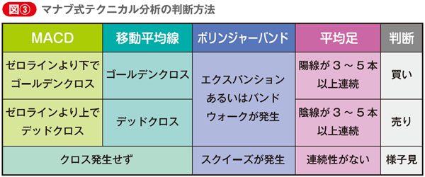 テクニカル分析は、平均足+MACD+移動平均線が基本なのですが、慣れてきたら前回紹介したボリンジャーバンドも加えるとよりトレンド把握がしやすくなります。最初のうちは、テクニカル分析を増やしてしまうと逆に迷ってしまうため、徐々に増やして精度を上げていくのが良いでしょう。また、売買判断に関してですが、私の場合、全てのシグナルが同じ方向を示したらエントリーするというよりは、優先順位を決めて判断しています(図③)。