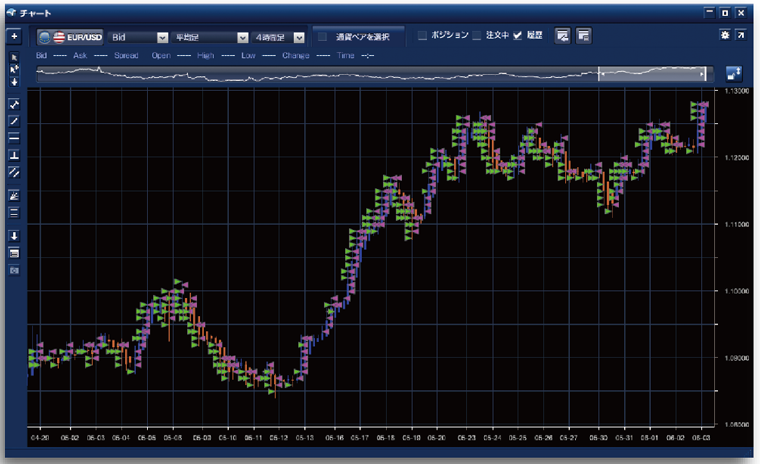 このように通貨ペアの中でも最も取引高が大きいユーロドルは、一度トレンドが発生するとそのまま継続することが多いため、流れさえつかんでしまえばトラッキングトレードで簡単に利益を増やすことができます。