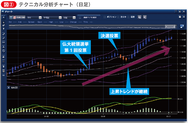 前回の記事執筆時は、2017年4月23日(日)に行われたフランス大統領選挙の第1回投票で、事前に予想されていた通りマクロン氏とルペン氏が決選投票に進んだことを受け、ユーロは上昇トレンドが継続しました。その後さらに、5月7日(日)に行われた決選投票では、中道派で親EUのマクロン候補が勝利、ユーロ買いに拍車がかかり、ユーロドルは約半年ぶりに1.1200台へ上昇しています(図②)。