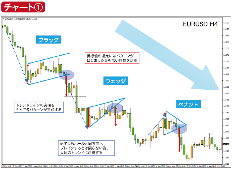 それでは、各チャートパターンの特徴を解説していきます(図①参照)。まずペナントについてですが、これは三角旗(ペナント)とポールの形状が含まれていることが構成条件です。
