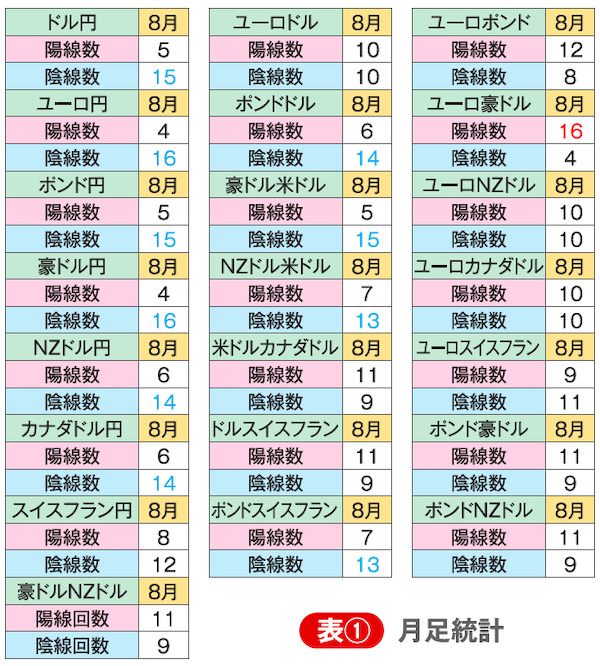 まず表①を見てください。これは8月につけた月足(過去20年分)が陽線・陰線のどちらであったかを数えたものになります。見て分かるように、クロス円の陰線回数が多くなっています。特にユーロ円と豪ドル円の陰線回数が16回、ドル円とポンド円の陰線回数が15回とかなり偏っています。全20回中16回ということは確率に直すと80%、15回ということは75%になります。私は全24通貨ペアの月足の統計を取っていますが、80%以上というのは6回しか出現していないぐらい強い確率になります。そのうちの二つが8月のクロス円に集中しているという、とても珍しい月になります。