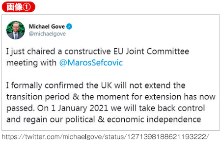 これとほぼ同じタイミングで、ゴーブ内閣府担当相は自身のツイッターで以下の発言をしています(画像①)。「英国は6月末の期限を待たず、移行期間の延長をしないことを、正式に公言する。2021年1月1日から、英国は政治的、経済的な独立を手にし、国家主権を自分たちの手に取り戻すことになる」。