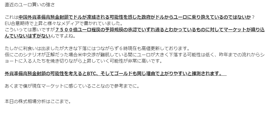 直近7月21日の7/21 株式相場分析&現状のファンダメンタルズ分析では、米中摩擦の観点から、今後ユーロに焦点があたるのではないかと指摘されています。