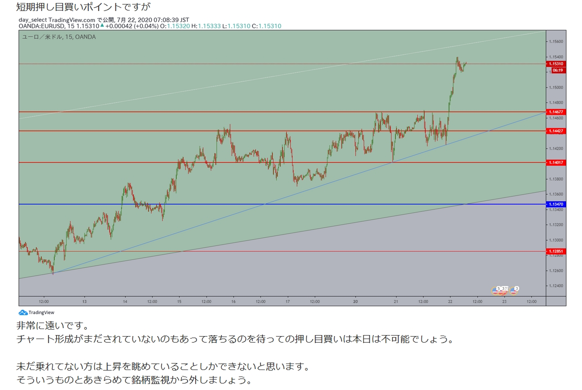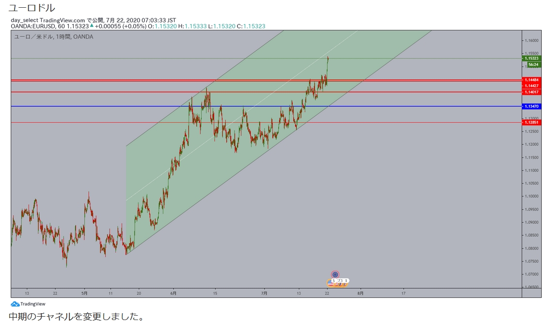 7/22 為替相場分析のチャート分析では、ユーロドルの上昇をチャネルで分析し、拾いどころを探していますが