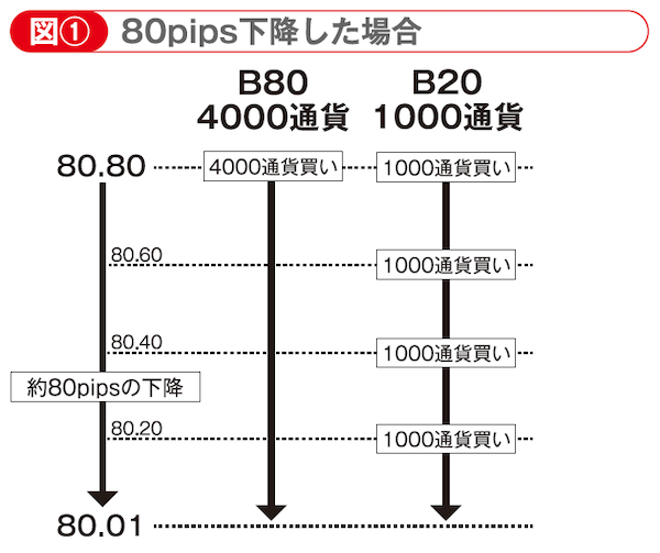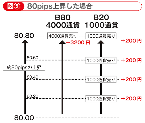 この条件下で、今度は一気に80pips上昇したところをイメージしてみましょう。B80は4000通貨で80pipsの差益ですので、売買の利益は3200円。それに対しB20は1000通貨で20pipsの差益なので、売買の利益は200円を4回で800円。