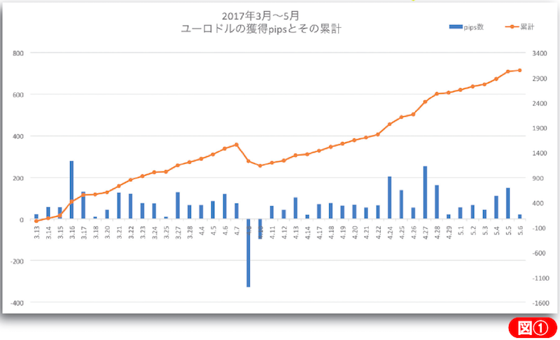 先月号では、ユーロ圏がファンダメンタルズ的に強くなったことから、私がよく利用しているMACD(日足)と移動平均線(日足)を使い、ゴールデンクロスが出たタイミングの2017年3月13日にトラッキングトレードでユーロドルの買いをスタートしたという内容をご紹介いたしました。その後、ユーロドルは現在まで図①のように順調に上昇し、3月~5月で3044.4pipsの利益を上げています。