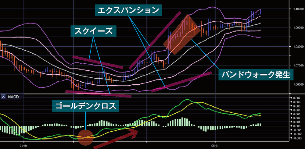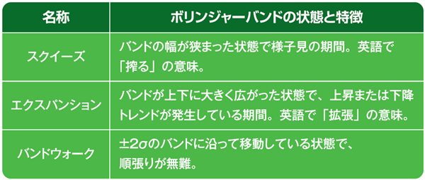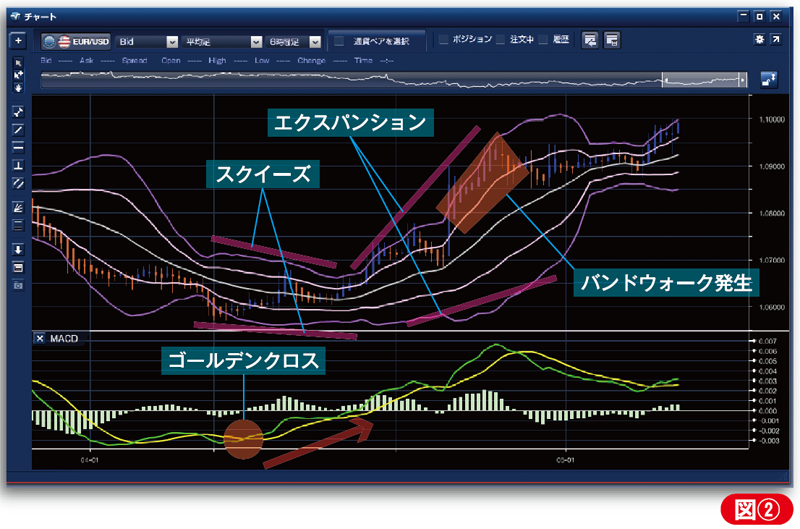 トレンド転換を見極める上で、比較的分かりやすいのがボリンジャーバンドです。図②のように、ボリンジャーバンドには、もみ合い相場で収縮(スクイーズ)したバンドが、トレンド発生と共に広がっていき(エクスパンション)、トレンド方向に傾いたままバンドに沿って価格が推移する(バンドウォーク)という特徴があります。