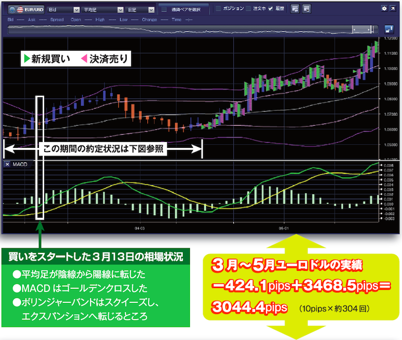 先月号で紹介した「平均足+移動平均線+MACD」にボリンジャーバンドを併用して確認し、図①のように調整の入った局面でもボリンジャーバンドはエクスパンション(広がる)することなく、3月の安値を割ることがなかったこと、そしてMACDが買い転換を示したことから、トラッキングトレードをそのまま継続し、最終的には先月号でご紹介した1206.4pipsの利益から3044.4pips(10pips×約304回)へと、さらに利益を伸ばすことができました。