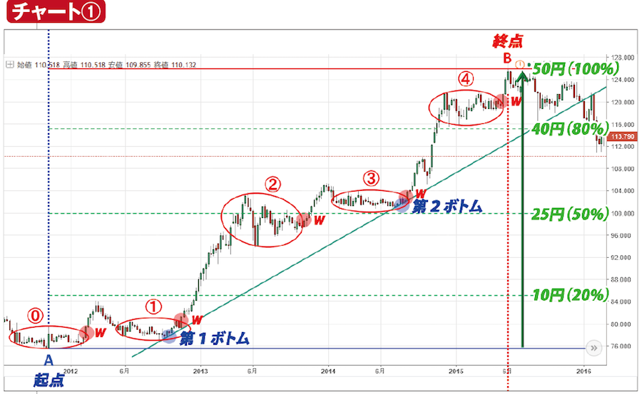 結果論にはなりますが、東日本大震災の年となる2011年終盤以降のドル円相場(チャート①参照)は、2011年10月末に75円中盤の最安値Aを付けてから、2015年6月に125円台終盤の最高値Bまで大きな上昇トレンドがありました。このレンジを天底だと今いうのは簡単ですが、いずれにしても上昇相場の最安値Aはトレンドの起点、最高値Bはトレンドの終点と認識できます。