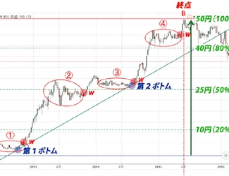 さて、ここで2015年11月から最近までの長期チャートを見てください。チャート①の上はドル円、下はNZドル円です。上下のチャートを見比べると、二つの通貨ペアの値動きは似ていますが、チャートの右端のようにかなり違う所もありますね。