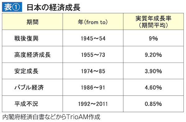 1955年から1973年までの18年間、実質成長率は実に最高20.9% (1961年)、最低でも5.0%(1971年)で、年平均9.2%とすさまじい勢いでした。ここで日本の経済成長を一覧してみましょう(表①)。