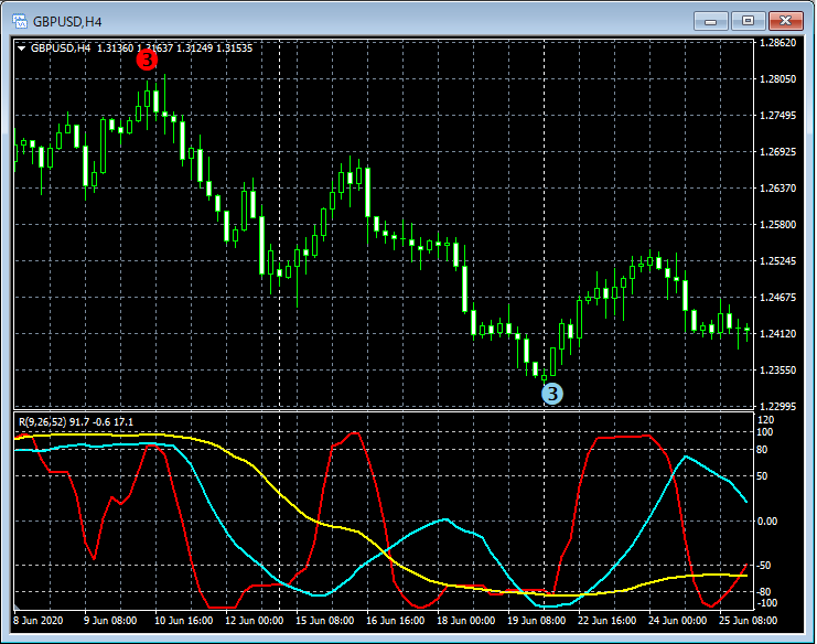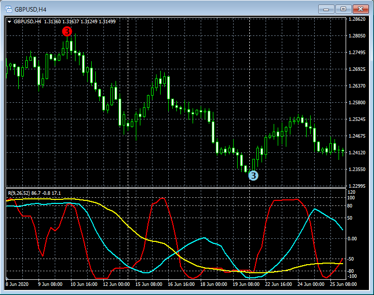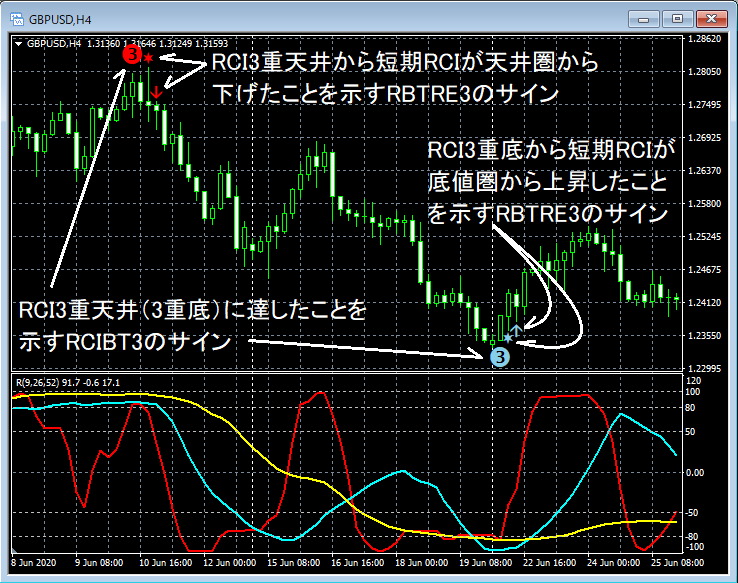 このケースでは、RCI3重天井(3重底)からすんなりとプライスが下降(上昇)に転じていることもあり、RBTRE3のサインでプライスの反転下降(上昇)を上手くとらえることができていると言えるかもしれません。