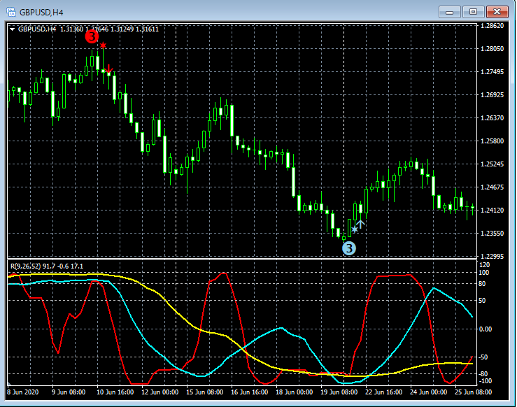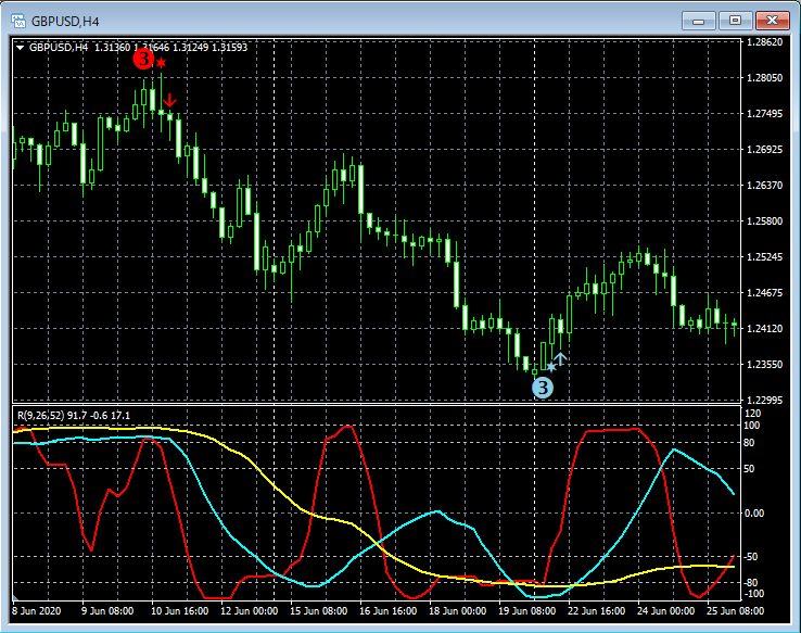 短期中期長期の3本のRCIが売られすぎラインに達した後、短期のRCIが売られ過ぎラインの外側(下)から内側(上)に戻ってきたときに空色の星印が点灯します。