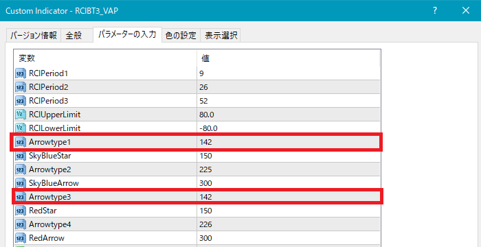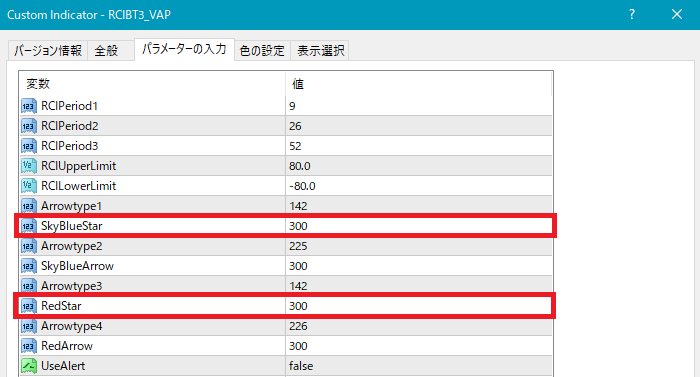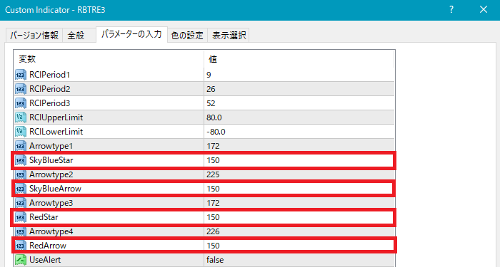 必要があれば、SkyBlueStar, SkyBlueArrow, RedStar及びRedArrowの値を修正することにより、RBTRE3の星印と矢印の表示位置を適宜修正します。