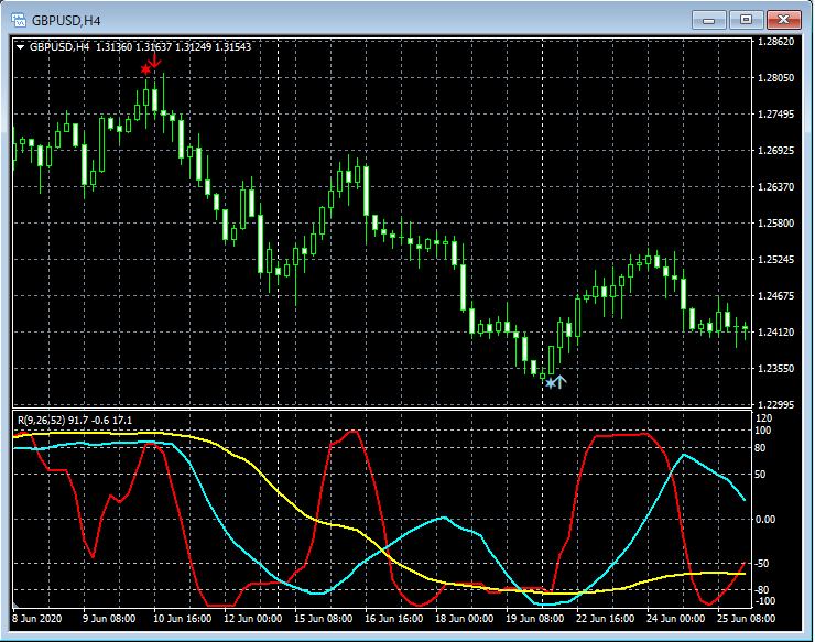 短期中期長期の3本のRCIが買われ過ぎライン(売られすぎライン)に達した後、短期のRCIが反転して買われ過ぎライン(売られすぎライン)の外側から内側に戻ってきたタイミングを表示する矢印インジケーター