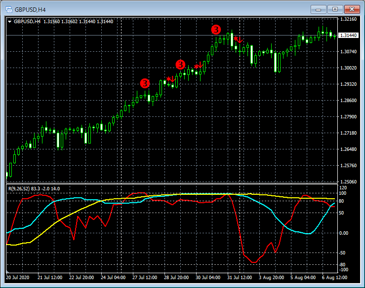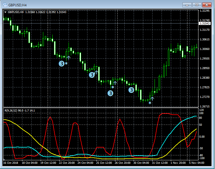 このケースは、非常に強い下降レンドが発生している考えられる場面で、1回目から3回目のRBTRE3のサイン発生はプライスの上昇につながっていませんが、4回目のRBTRE3のサイン発生以降にプライスが大きく上昇していることが分かります。