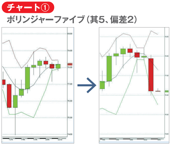 損切りによって利益を出す方法をお話しするにあたって、まずご説明しなければならないのが、ボリンジャーファイブです。通常、ボリンジャーバンドは、期間を20あるいは21日にして、レンジの上限下限を見るものです。この期間を5にしたもの(偏差は2)が、ボリンジャーファイブです。このボリンジャーファイブは、相場が動き出すタイミングを知らせるもので、結構な確率で当たります。