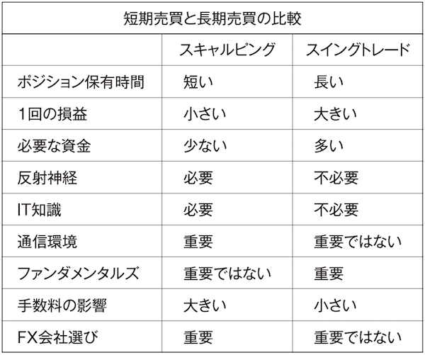 上の表にまとめましたが、短期トレードと長期トレード(ここではスイングトレード)の各要素は、対になっているものが多いです。ポジション保有時間は、ファンダメンタルズ要素の影響度に比例しますし、1回の損益や必要資金のサイズを左右します。