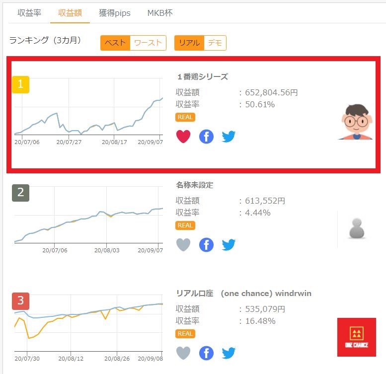 REAL-TRADEによる、3か月間リアル口座ランキングの収益額部門において1位となっている「一番鶏」(2020.9.8)。
