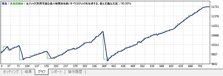 デモフォワードのほうを見ると、3月にドローダウンをおこし、その後順調に推移して利益を更新したところです。最新バージョンのVer1.9ではこの3月のドローダウンが小さくなるよう最適化されてバージョンアップされています。