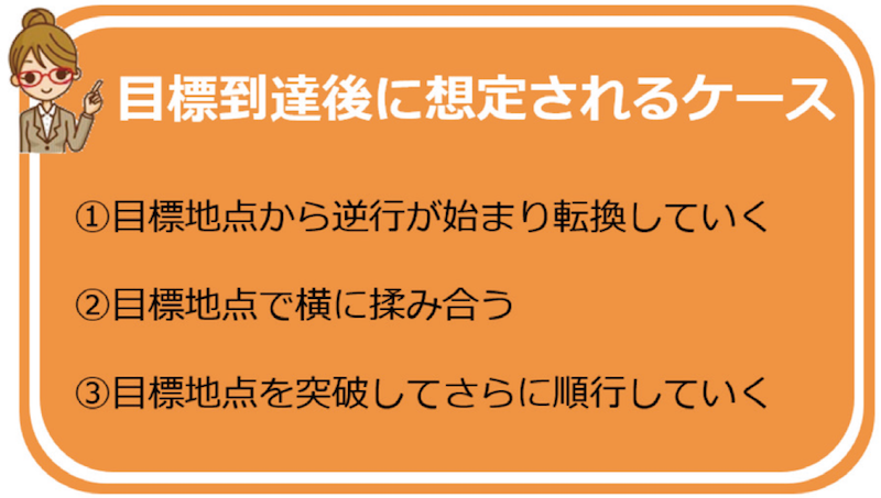 最後に「③目標地点を突破してさらに順行していく」ですが、文字通り目標到達なんのその、そのままの勢いで目標を突破してさらに次の目標に向かっていくケースです。こうなると次の目標へ向けて再びエントリーを狙っていくことになります。