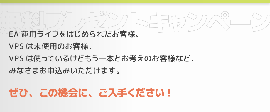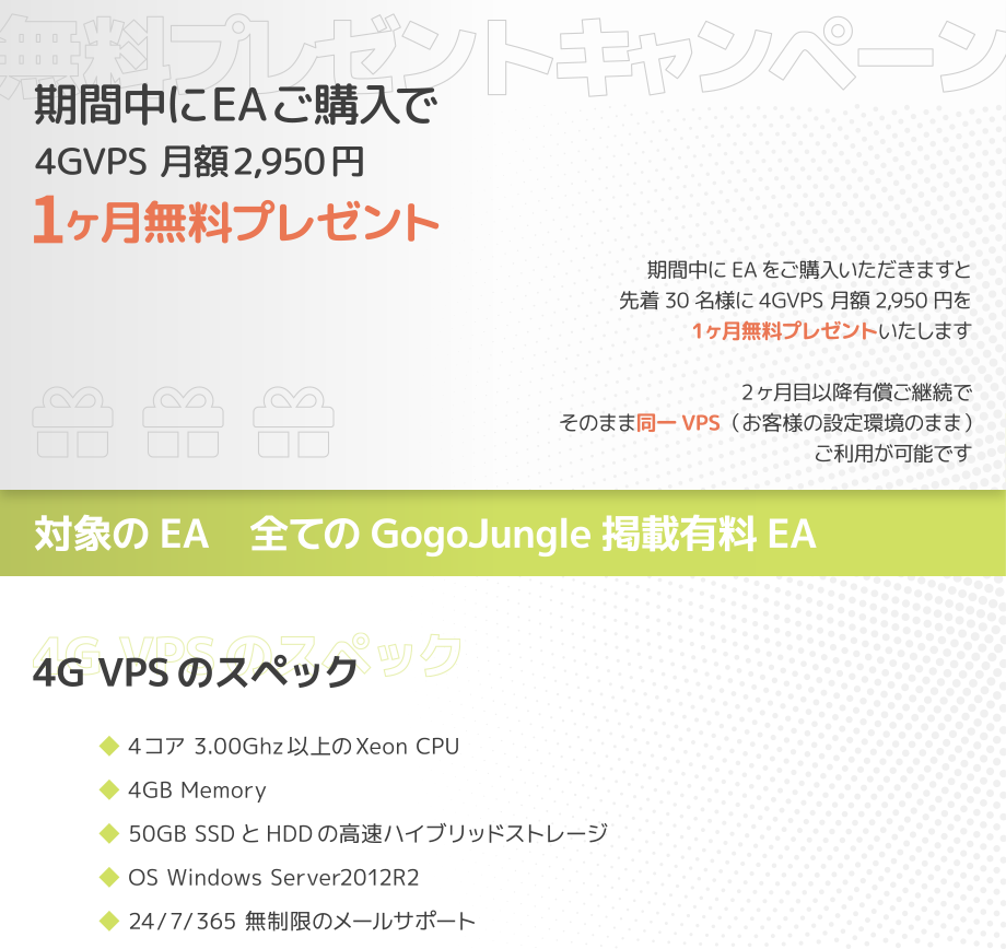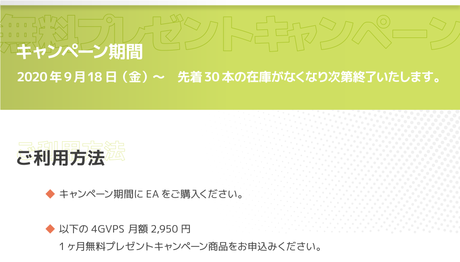【まずは先着10名様限定】期間中にEAご購入で 4GVPS 月額2,950円 1ヶ月無料プレゼントキャンペーン