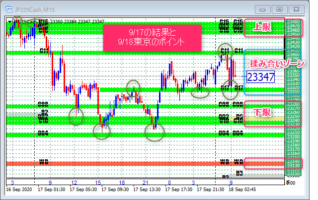 NYから続く“揉み合いゾーン”23310=23410の揉み合いからブレイクした方に流れができます。