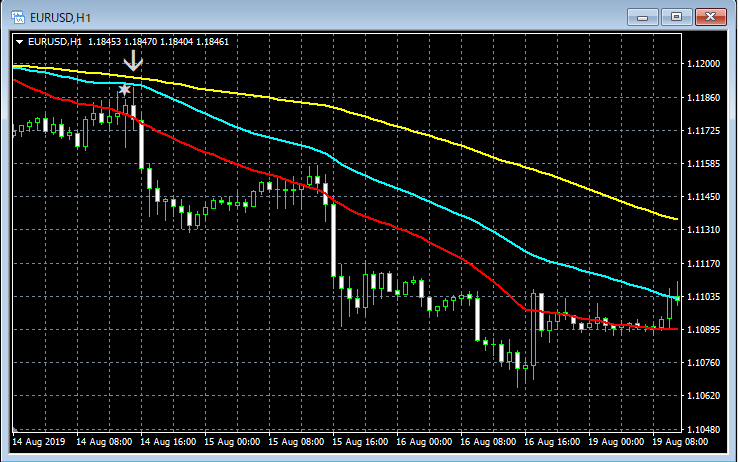 「任意の3本の移動平均線(短期線,中期線,長期線)の中で、短期線が反転したタイミングで3本の移動平均線の方向がそろったら知らせてくれるMT4インジケーター」