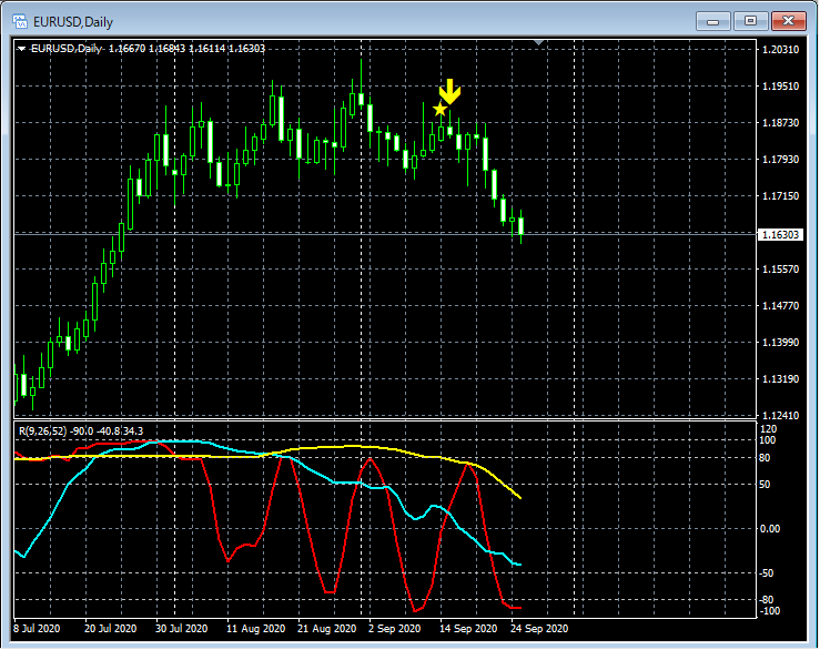 RCI3本ラインがそろって下げとなる前のタイミングを狙う -最近のユーロドル日足チャートから-